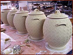 On any given day you'll find pots in all stages of completion. Sometimes the ware carts are full. Other times, right after a series of firings and art fairs, there will only be a few pieces in progress.